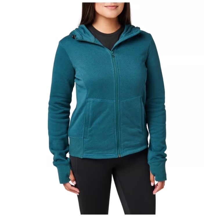 When the temperature suddenly drops, our Kimmie Full Zip Hoodie offers a warm hug. The 60% cotton and 40% polyester fleece construction provides a cozy outer layer on cool days and doubles as an inner layer when the mercury really plunges. An internal shock cord system keeps the stationary lined hood in place in heavy winds and while running. A durable front zipper design with chin guard works in tandem with rib knit cuffs and waistband to help beat the cold. Thumbholes hold the sleeves in place when you’re training, working, or adding layers. Side entry welt hand pockets keep essential items at hand and fingers toasty warm. A reflective transfer on the right sleeve increases visibility during early morning and late evening runs. Fight the chill, with the Kimmie Full Zip Hoodie.