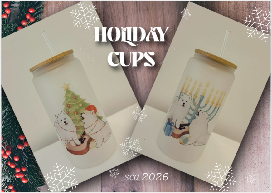 Bring on the Holiday Cheer with these festive Frosted Glass Cups in our Christmas or Hanukkah SCA 2026 Logos! Lid and Straw included. The cup is Dishwasher safe, but we suggest hand washing to extend the image quality. Perfect for iced coffee, lemonade, or some good southern sweet tea!
