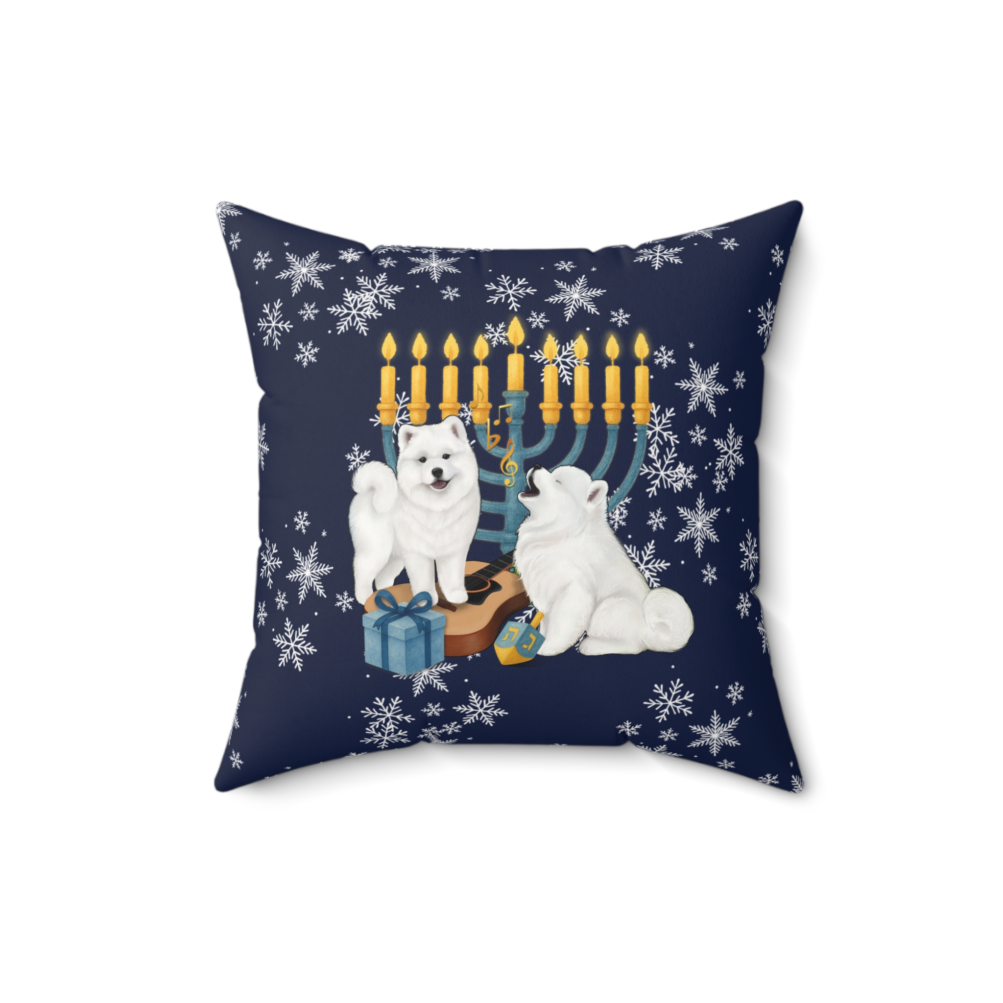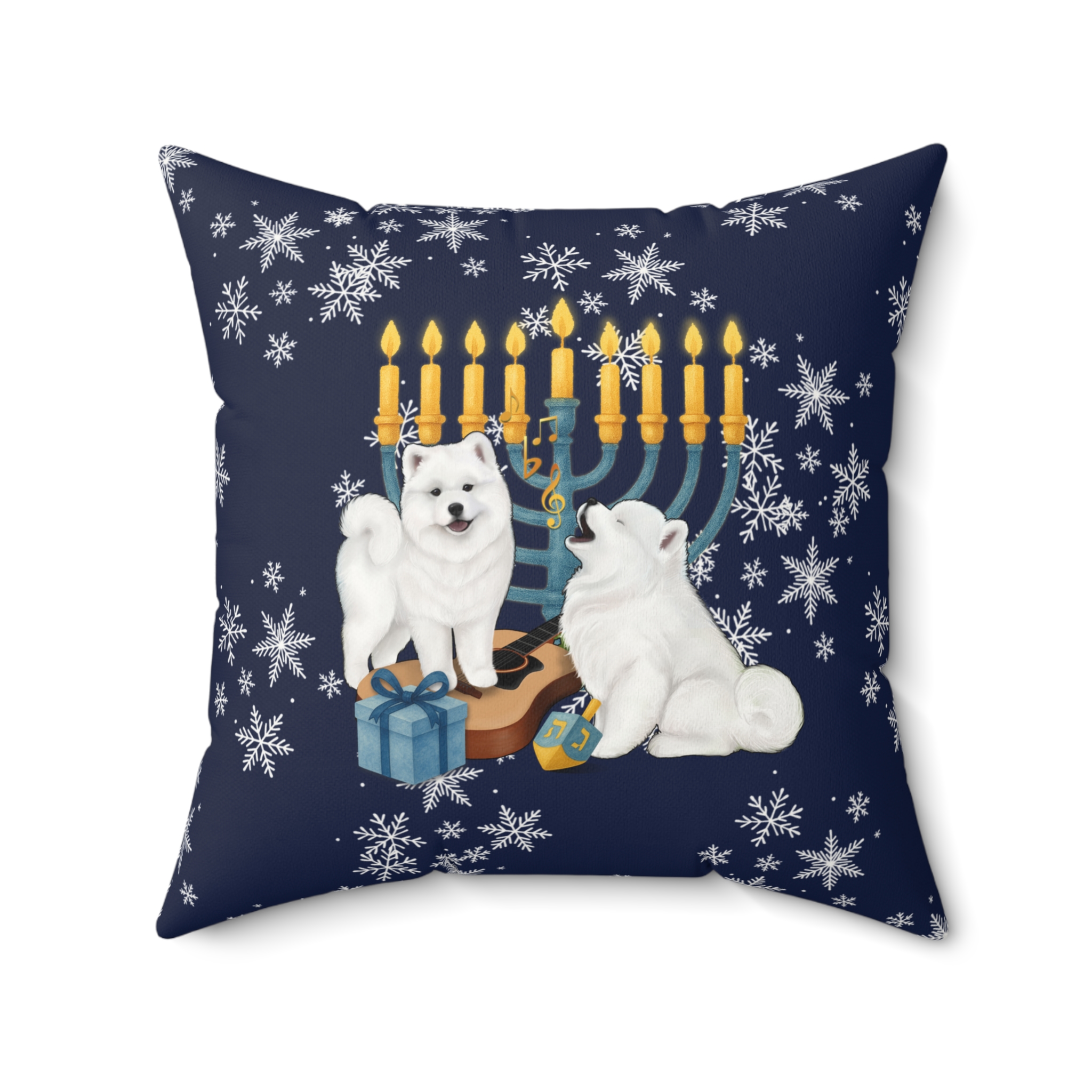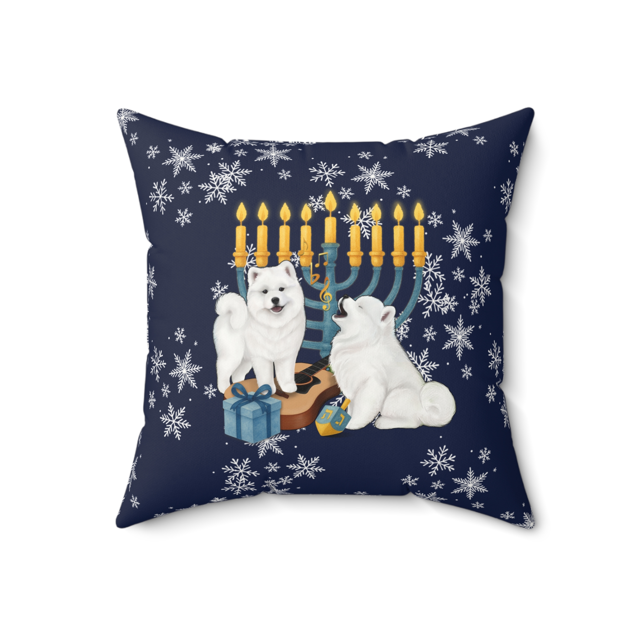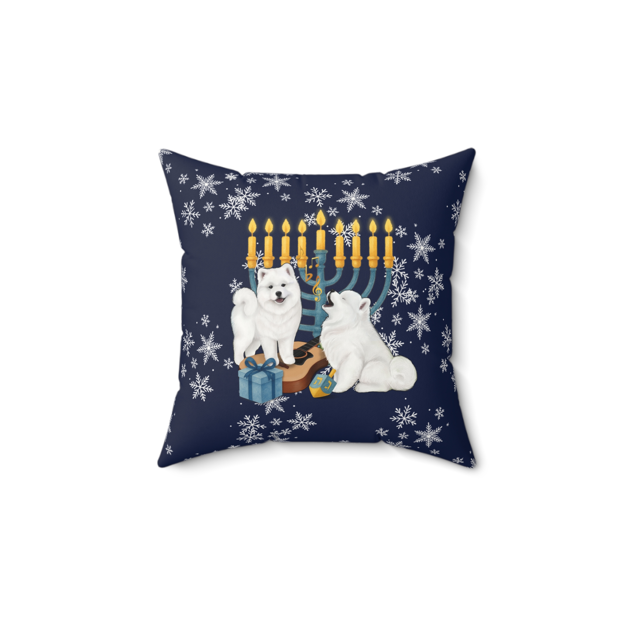 This snow-dusted pillow brings a quiet, cozy evening to your sofa. Two fluffy samoyeds play beside a glowing menorah, gifts at their paws and soft snowflakes drifting around—an image that feels like coming in from the cold and settling into a warm, familiar hearth. The faux suede cover has a velvety touch and a gentle sheen. Double-sided printing allows for versatility, while the generously stuffed recycled-poly insert gives the square pillow a plump, sink-in softness. This cushion fits into holiday gatherings and slow winter nights, adding a homespun, warmth to mantel displays, reading nooks, or family rooms.